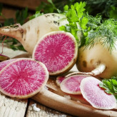ترب هندوانه ای گیاهی است یک ساله و جزو گیاهانی است که ریشه خوراکی دارد و بومی جنوب آسیا و اروپا است و سپس در تمامی جهان کاشته شده است. طعم ترب هندوانه ای شیرین بوده و عطر زیادی دارد. داخل آن به رنگ قرمز یا صورتی بوده و سطح خارجی آن ترکیبی از رنگ های سبز و سفید می باشد. ترب هندوانه ای سرشار از ویتامین ث، فولیک اسید، ویتامین ب ۶، ریبوفلاوین، تیامین، آهن، منیزیم، مس و کلسیم است، کم کالری بوده و منبع خوبی از فیبر است. برای رنگارنگ کردن و تزئین سالاد مورد استفاده قرار می گیرد.